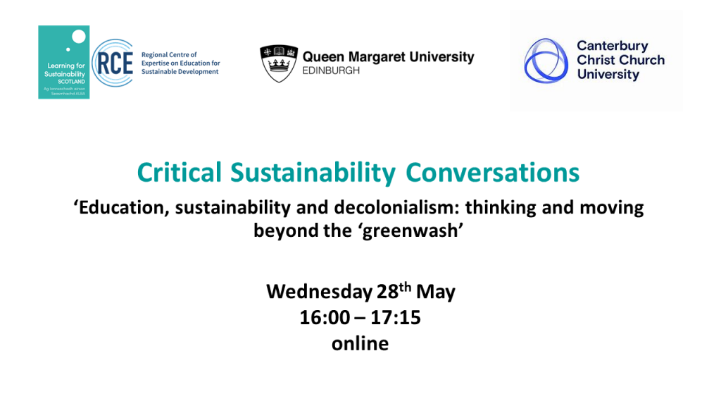This Conversation focused on ‘Education, Sustainability and decolonialism: thinking and moving beyond the greenwash’ and was held in collaboration with colleagues from Queen Margaret University and Canterbury Christ Church University.