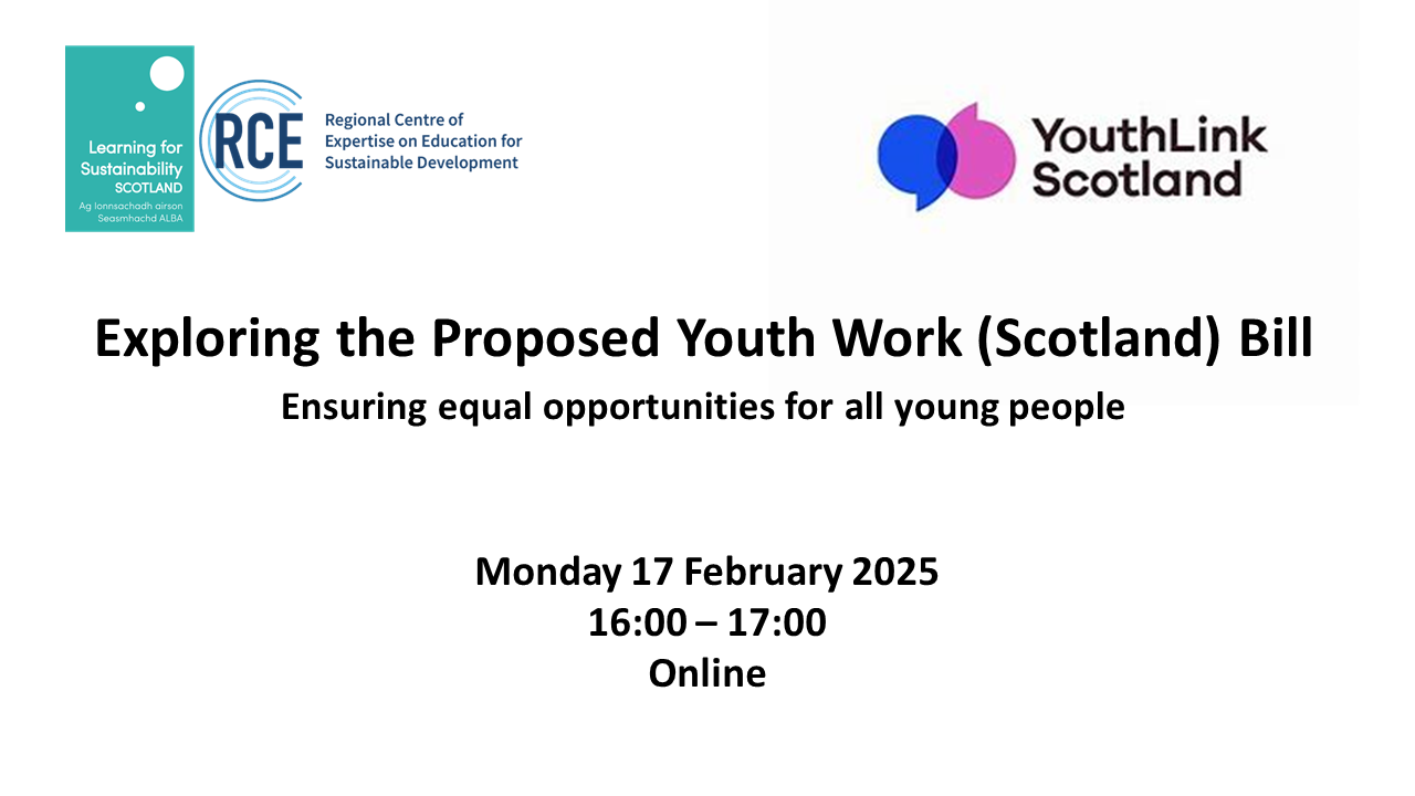 Join Learning for Sustainability Scotland and YouthLink Scotland on Monday 17 February from 16:00 - 17:00 to hear more about the Proposed Youth Work (Scotland) Bill.